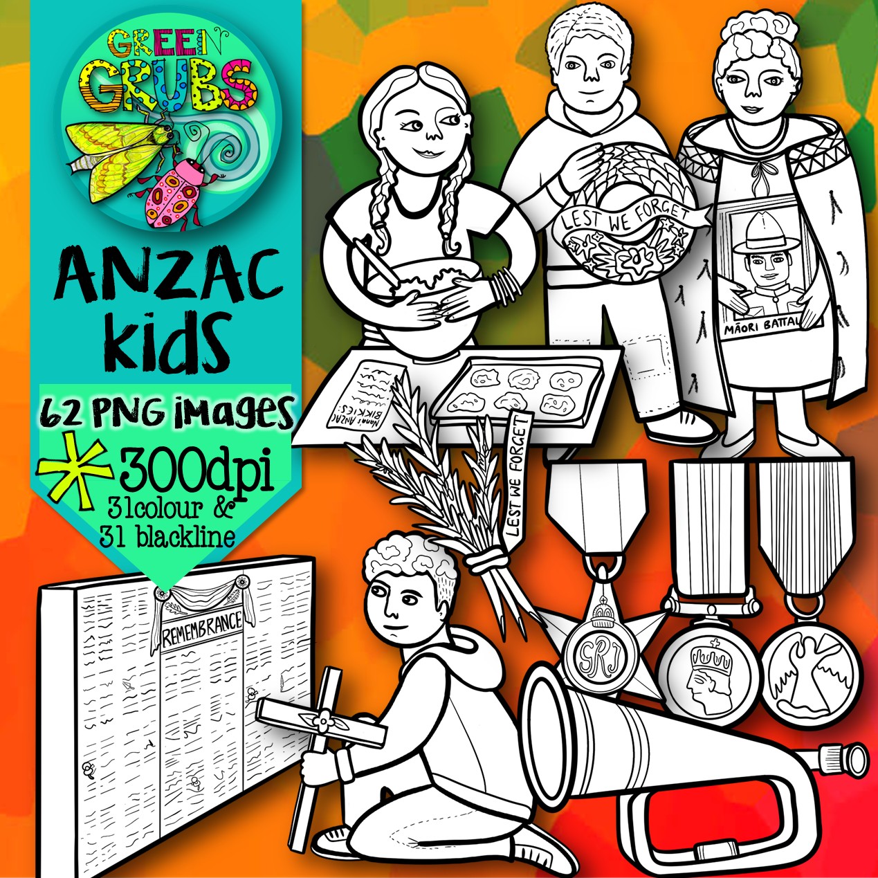 This set contains 62 images (31 colour and 31 blackline) as high quality (300 dpi) PNGs with transparent backgrounds.